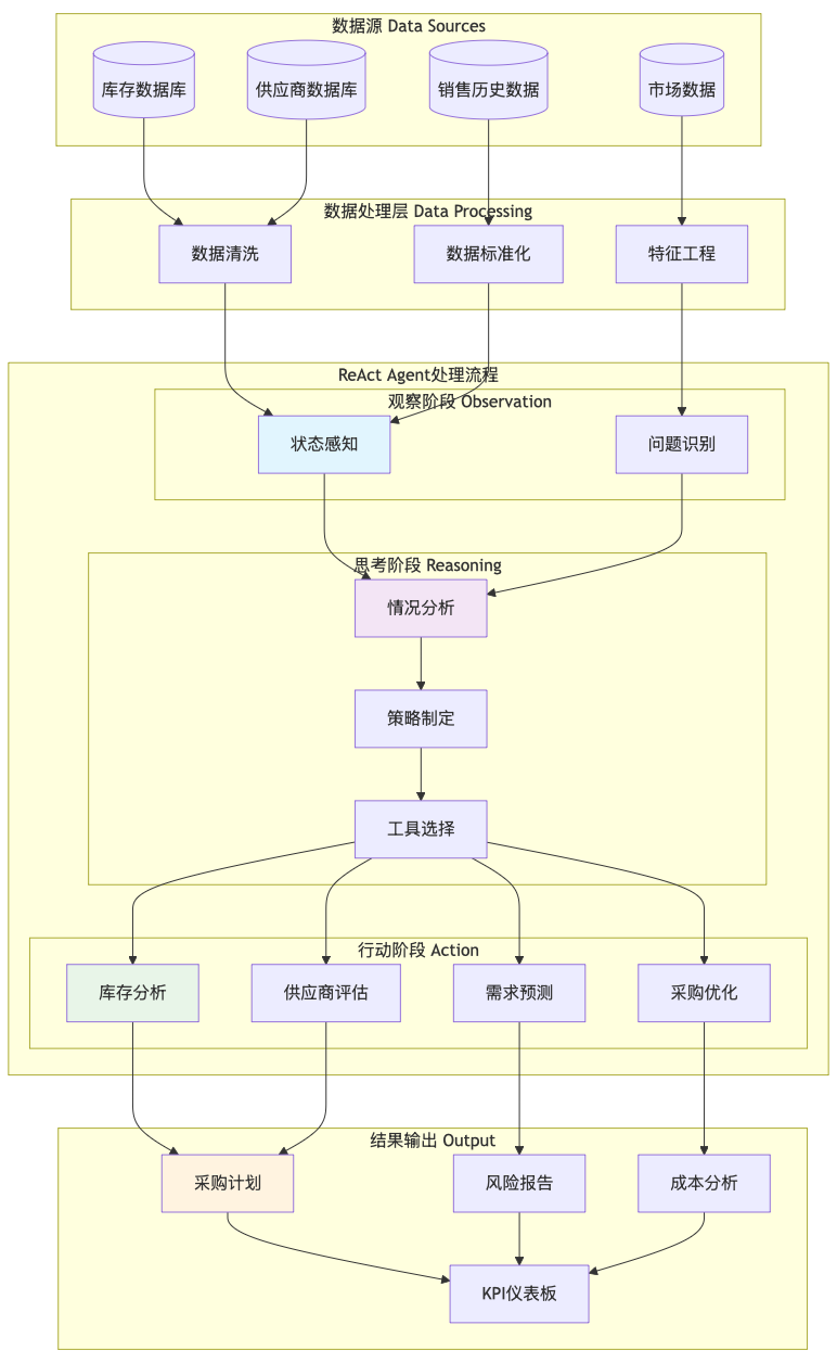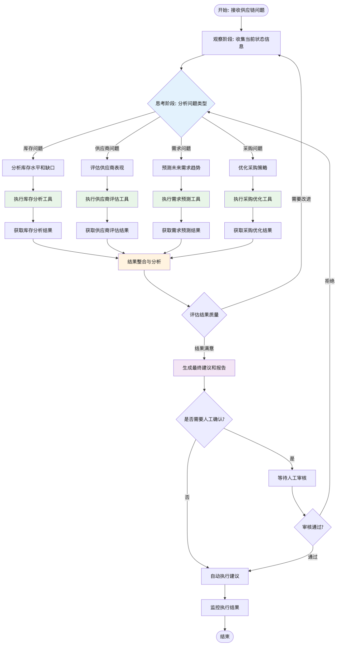 class SupplyChainReActAgent: """供应链管理ReAct Agent 核心特性: - 实现完整的ReAct循环 - 集成多个MCP工具 - 支持上下文记忆 - 提供决策可解释性 """ def __init__(self): # 初始化工具集 (假设其他工具已定义) self.tools = { 'inventory_analysis': InventoryAnalysisTool(), 'supplier_evaluation': SupplierEvaluationTool(), # 'demand_forecast': DemandForecastTool(), # 'procurement_optimization': ProcurementOptimizationTool() } self.memory = [] # 历史决策记录 self.current_context = {} asyncdef think(self, observation: str, context: Dict[str, Any]) -> str: """思考阶段:分析情况并制定推理策略 推理过程: 1. 解析当前观察内容 2. 分析可用的上下文信息 3. 识别需要解决的问题类型 4. 制定工具调用策略 """ self.current_context.update(context) reasoning_steps = [] # 基于上下文分析需要执行的任务 if'inventory_data'in context: reasoning_steps.append("检测到库存状态信息,需要分析库存水平。") if'supplier_data'in context: reasoning_steps.append("发现供应商数据,应评估供应商表现。") # 检测紧急情况 if'紧急'in observation or'不足'in observation: reasoning_steps.append("检测到紧急情况,提高处理优先级。") reasoning = f""" 观察: {observation} 推理过程: {chr(10).join(f"- {step}" for step in reasoning_steps)} 执行计划: 1. 库存分析 - 了解当前库存状态 2. 供应商评估 - 评估可用供应商 3. 采购优化 - 制定最优采购计划 (需要前序步骤结果) """ return reasoning asyncdef act(self, action_plan: str) -> Dict[str, Any]: """行动阶段:执行工具调用和决策 执行策略: 1. 按依赖关系顺序执行工具 2. 传递上下文信息 3. 收集执行结果 4. 处理异常情况 """ results = {} try: # 1. 库存分析 if'inventory_data'in self.current_context: results['inventory_analysis'] = await self.tools['inventory_analysis'].execute( inventory_data=self.current_context['inventory_data'] ) # 2. 供应商评估 if'supplier_data'in self.current_context: results['supplier_evaluation'] = await self.tools['supplier_evaluation'].execute( suppliers=self.current_context['supplier_data'] ) # 后续工具调用... except Exception as e: results['error'] = str(e) return results asyncdef observe(self, action_results: Dict[str, Any]) -> str: """观察阶段:分析执行结果并生成新观察 观察重点: 1. 分析各工具的执行结果 2. 识别关键发现和异常 3. 更新系统状态认知 4. 为下一轮决策准备信息 """ observations = [] # 分析库存分析结果 if'inventory_analysis'in action_results: inv_result = action_results['inventory_analysis'] low_stock_count = len(inv_result.get('low_stock_items', [])) if low_stock_count > 0: observations.append(f"发现{low_stock_count}个商品库存不足。") # 分析供应商评估结果 if'supplier_evaluation'in action_results: sup_result = action_results['supplier_evaluation'] top_supplier = sup_result.get('top_suppliers', [{}])[0] if top_supplier: observations.append(f"最佳供应商: {top_supplier.get('name')} (评分: {top_supplier.get('composite_score')})。") # 存储到记忆中 self.memory.append({ 'timestamp': datetime.now().isoformat(), 'action_results': action_results, 'observations': observations }) return"\n".join(f"- {obs}"for obs in observations) if observations else"未发现显著问题。" asyncdef react_cycle(self, initial_observation: str, context: Dict[str, Any]) -> Dict[str, Any]: """完整的ReAct循环执行""" # Think -> Act -> Observe reasoning = await self.think(initial_observation, context) action_results = await self.act(reasoning) final_observation = await self.observe(action_results) return { 'cycle_timestamp': datetime.now().isoformat(), 'initial_observation': initial_observation, 'reasoning': reasoning, 'action_results': action_results, 'final_observation': final_observation }