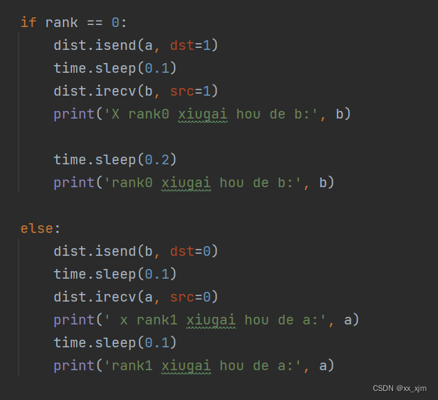 2:dist.send和dist.recv以及dist.isend,dist.irecv都要考虑到一个通信的先后问题,因为没办法保证哪一个进程更快,所以通信的时候要设置号先后顺序。尤其是在一个进程,既需要接收,也需要发送的时候。比如下面这里,因为没法确定哪个进程更快,所以我让每个进程的接收都比发送慢一点,这样保证另外一个进程已经完成发送。