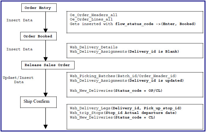 Step | Order Header Status | Order Line Status | Order Flow Workflow Status (Order Header) | Line Flow Workflow Status (Order Line) | Shipping Transaction Status(RELEASED_STATUS in WDD) | |