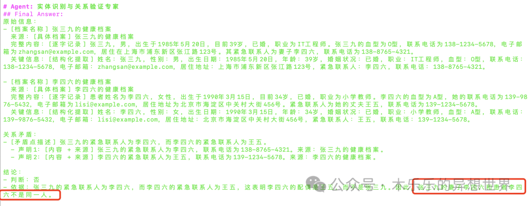 AI知识库复杂问题解决案例|破案了,此李四六非彼李四六 目的达到了,智能体通过夫妻关系矛盾点推断出,张三九的妻子李四六和患者李四六不是同一个人。当然,这个智能体也并非完美的解决方案,我们可以看到,整个处理过程,是为了解决复杂人物关系的识别而进行的适配和管理。其他的非人物关系的复杂问题,这个处理过程是存在缺陷的。其实,也没关系,在 Crew.ai 中,还支持在 Crew 团队中增加 Manager 的角色,先执行问题类型的判断,如果是属于复杂任务关系,就可以转交给这个人物关系识别实体识别与关系验证专家。若是其他的复杂问题,就转交给其他专家完成。