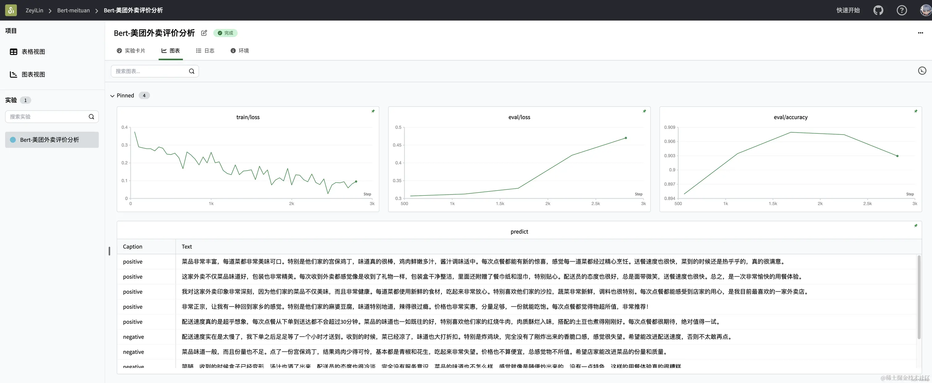 BERT实战-美团外卖评论情感分类实战:SwanLab可视化训练 基于Bert模型的美团外卖评论数据集的文本情感分类,是自然语言处理领域的经典案例之一。这篇文章我将带大家使用 SwanLab、Transformers、datasets 三个开源工具,完成从数据集准备、代码编写、可视化训练的全过程。我们需要安装以下这4个Python库:一键安装命令:他们的作用分别是:BERT模型我们直接下载来自HuggingFace上由Google发布的bert-case-chinese(中文版Bert)预训练模型。执行下面的代码,会自动下载模型权重并加载模型:3. 加载Meitua