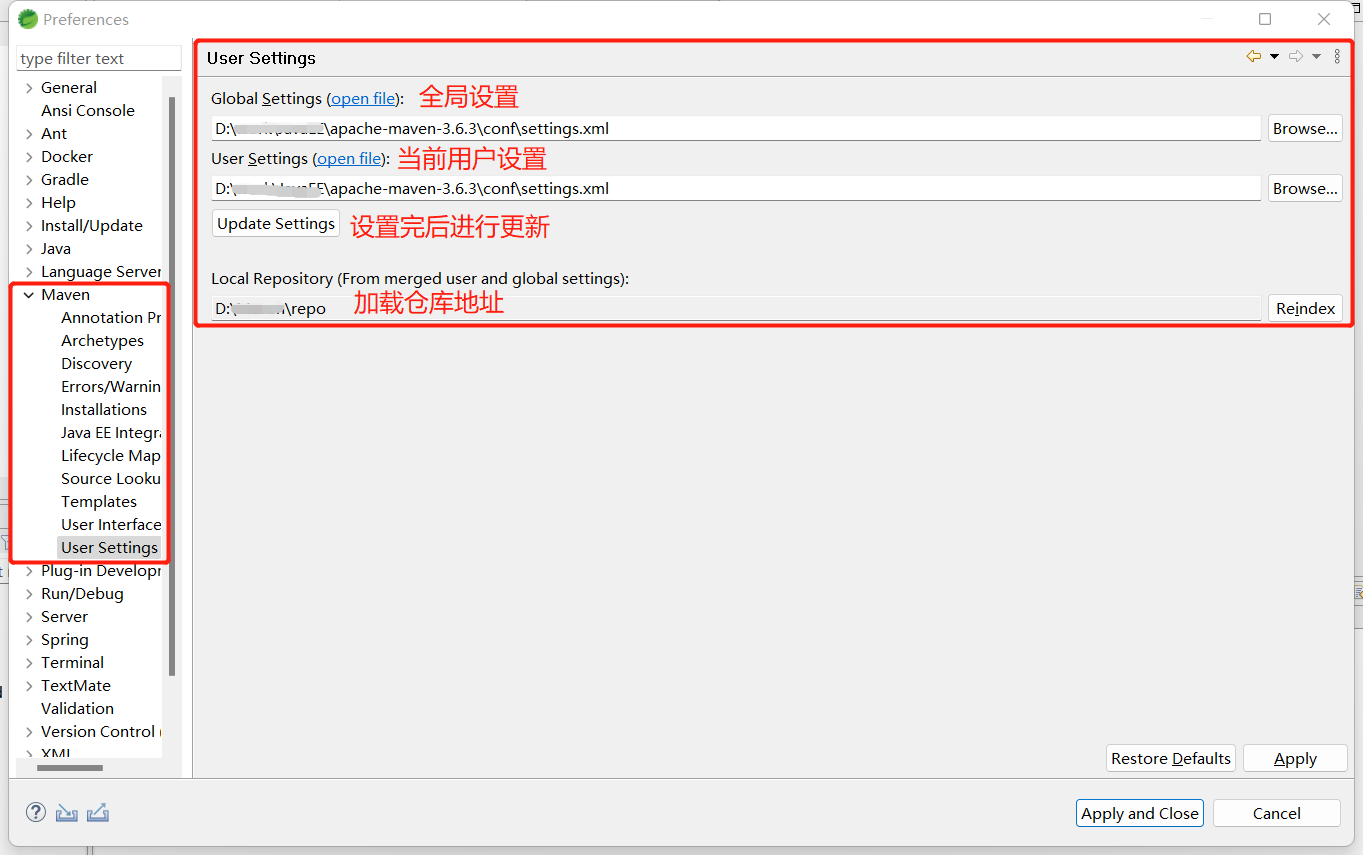 依次找到顶部菜单栏:Window---> Preferences---> Maven--->User Settings--->Global Settings & User Settings--->Apply