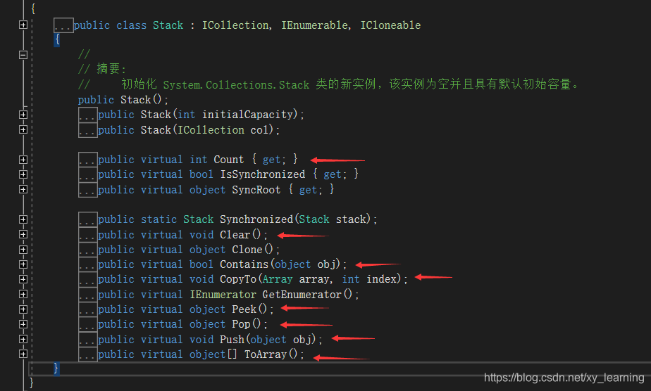 F12看Stack的定义。箭头所指的方法一般是我们常用的,可以看到这些方法都是虚方法,说明我们可以创建自己的特殊栈类,继承该类然后对这些方法进行改写。注意这里的ToArray()方法,是将该栈的一个副本保存到一个数组中,需要一个object类型数组来接受它(当然可以类型转换),而CopyTo()功能更强,可以指定将该栈中的元素拷贝到一个数组中的指定位置。注意拷贝到数组中的顺序都是以它出栈的顺序来的。