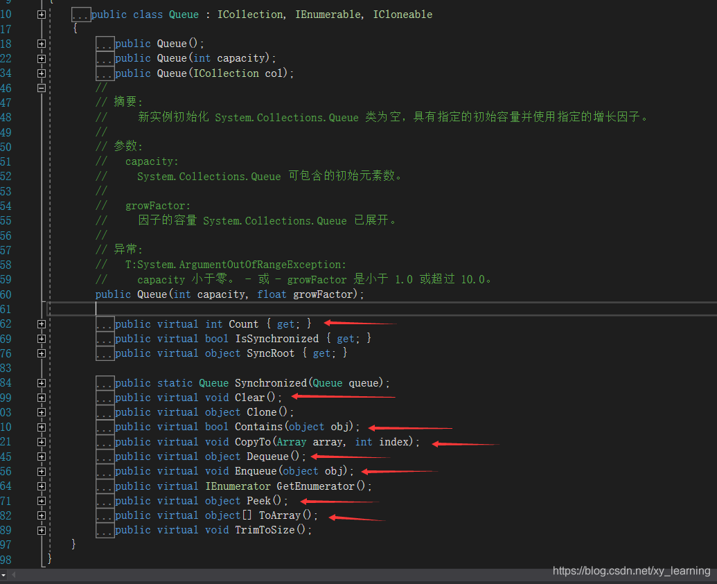 C#队列默认空间是32个,默认增加因子为2.0,也就是超过空间容量则会自动翻倍。大家也可以使用上述构造方法,设定初始容量和增长因子。其他方法与栈类似。注意这些都是虚方法,都可以在其父类中进行重写,比如基于该队列,我们可以构造一个优先队列类。