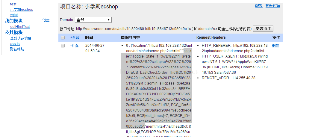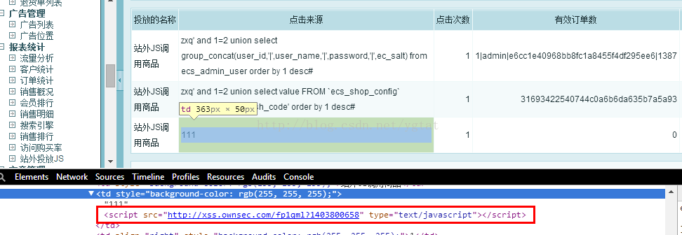 2) 漏洞存在于站外广告统计功能(对应管理后台的报表统计->站外投放JS),即/affiche.php页面,将from参数(网站来源referer)存储到了数据库表ecs_adsense,而在后台的“站外投放JS”读取出来未过滤又进入了sql语句,导致二次注入。(参考乌云http://www.wooyun.org/bugs/wooyun-2010-023188 )