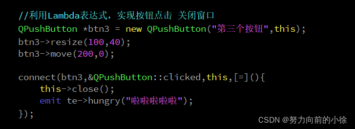 //需求 点击我的按钮 关闭窗口 //参数1 信号的发送者 参数2 发送的具体信号(函数的地址) 参数3 信号的接受者 参数4 处理的槽函数 connect(myBtn,&QPushButton::clicked,this,&QWidget::close);//父类的方式 //connect(myBtn,&MyQPushbutton::clicked,this,&MyWindow::close);//子类的调用方式