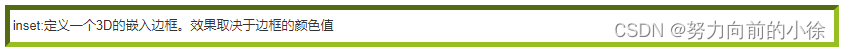 - inset:定义一个3D的嵌入边框。效果取决于边框的颜色值