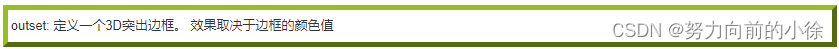 - outset: 定义一个3D突出边框。 效果取决于边框的颜色值