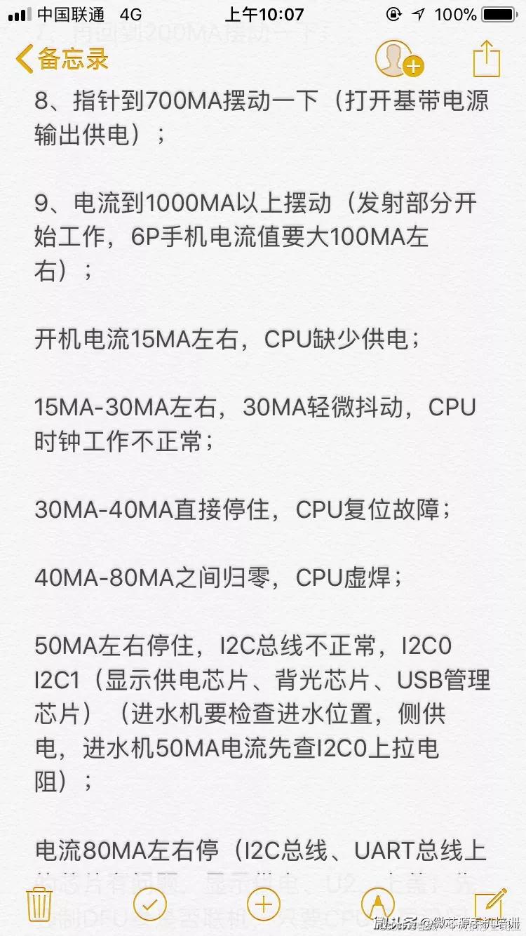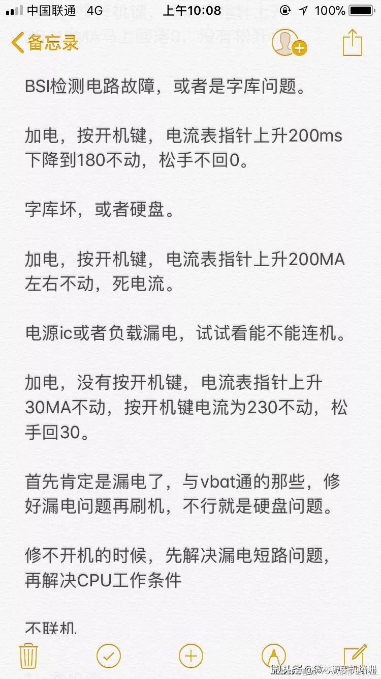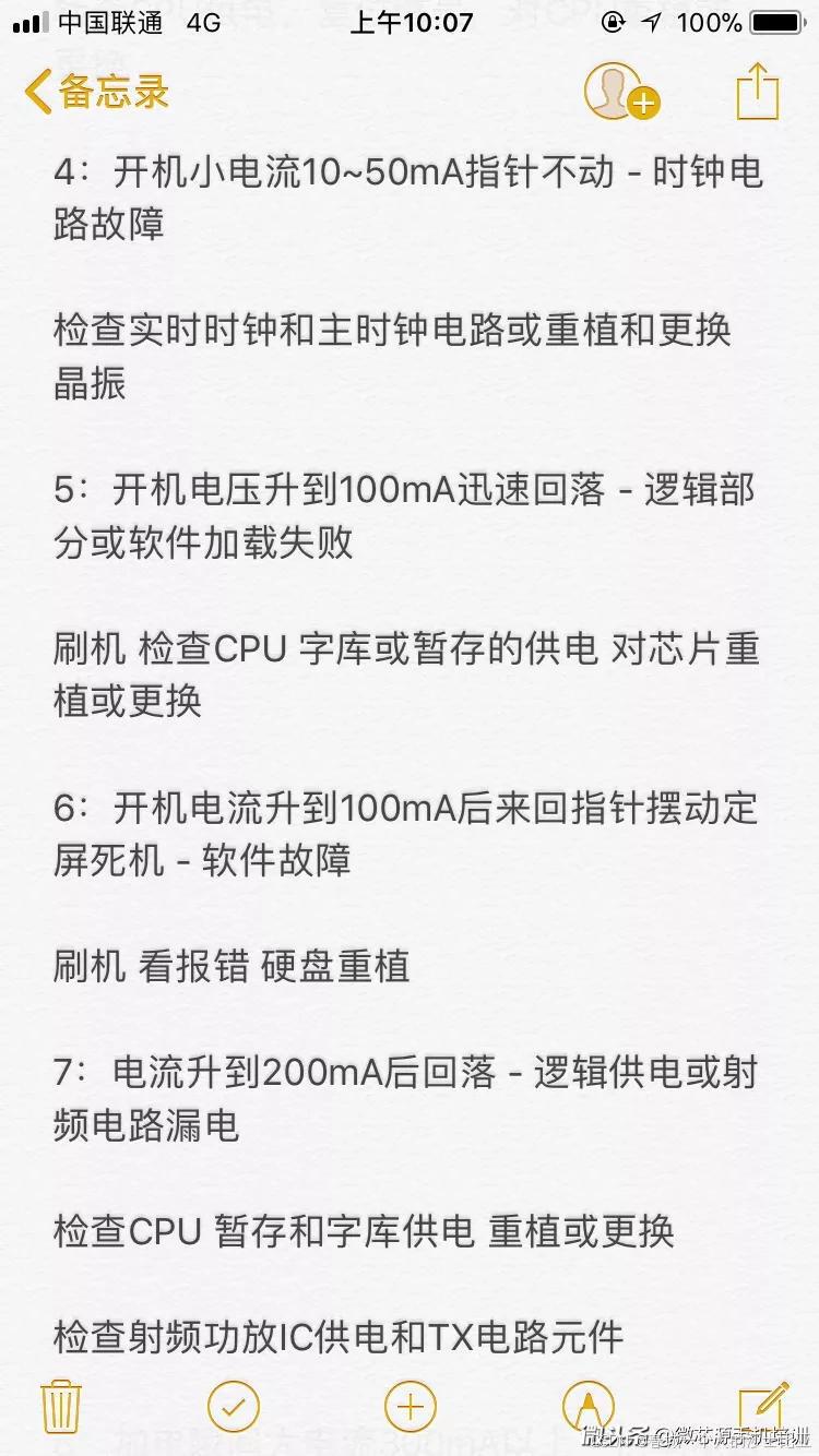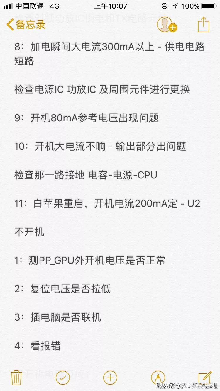 手机不开机7:手机接电源有小电流漏电,检查充电电路和电源IC供电电路相关元件。"