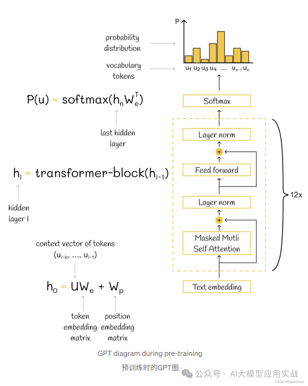 对于大多数LLMs来说,GPT的框架由两个阶段组成:预训练和微调。预训练是指在大量无标签数据上训练模型,以学习通用的表示和知识。
