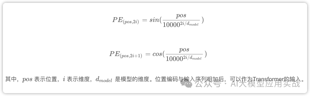 由于Transformer架构没有明确的顺序结构,因此需要引入位置编码来表示序列中元素的位置信息。位置编码是一个与输入序列相同维度的矩阵,可以通过正弦和余弦函数计算得到: