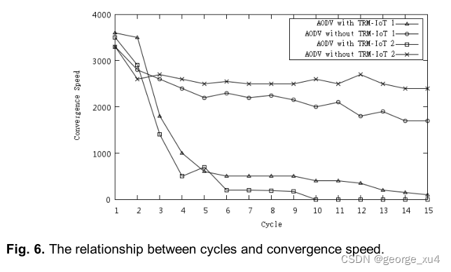 - 收敛速度:收敛速度(收敛速度CS)定义为处理失败的数据转发事务所需的最少循环次数。即CS越大,越不公平,表示如果信任模型有效,在几个交易周期后,可以通过信任值将良好节点与不良行为节点区分开来[31]。一开始,所有传感器节点具有相同的初始信任值,源传感器节点随机选择一个节点进行数据包转发。在少量交易后,良好节点比其他恶意节点获得更高的信任值。