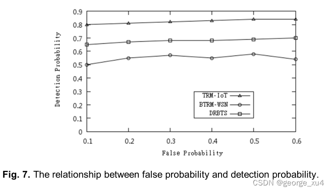 - 探测概率:DP (Detection Probability)表示信任信誉模型是否能够更好地处理来自第三方的错误推荐。在下图中,BRTM-WSN[11]模型的性能优于DRBTS[10]模型。这是因为BRTM-WSN模型可以更好地处理来自第三方的错误推荐。