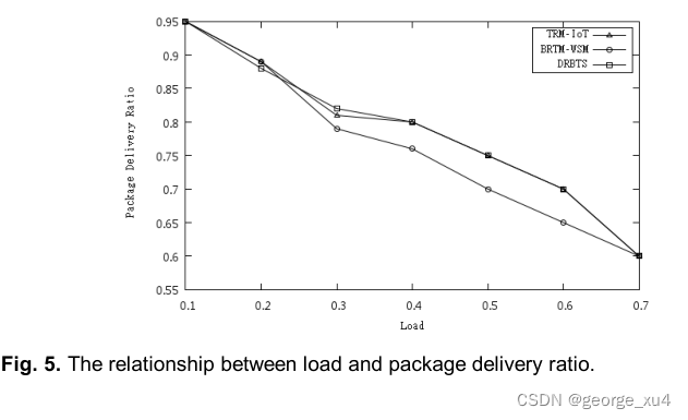 - 包的传递速率:在下图中,在PDR方面比较了提出的IoT/CPS、TRM-IoT的信任和声誉方案,以及现有的基于声誉机制的两种信任模型,即DRBTS[10]和BRTM-WSN[11]。实际上,包投递率(PDR)受丢包和重传包的影响。丢包的原因有很多。本文主要研究中间节点有意丢弃接收到的数据包,而不是将其转发到下一跳节点的行为。从图中,我们可以看到,提出的信任和声誉模型优于其他两种方案,特别是在网络负载较高的情况下。