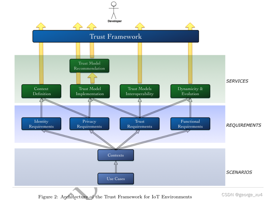 - 互操作性。来自不同制造商的具有不同功能的设备(可能遵循不同的标准)必须能够通信。此外,在物联网环境中可能共存的不同信任管理系统必须具有互操作性,并能够从其他信任系统交换信息。