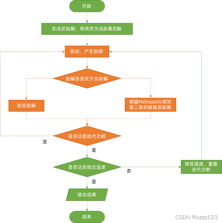 在上述算法流程图中,外部的绿色线框则表示退火中的降温过程,内部的橙色线框则表示退火过程中的等温过程,结合最初对金属退火过程的理解是不是更好容易理解一点。