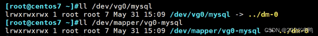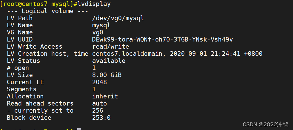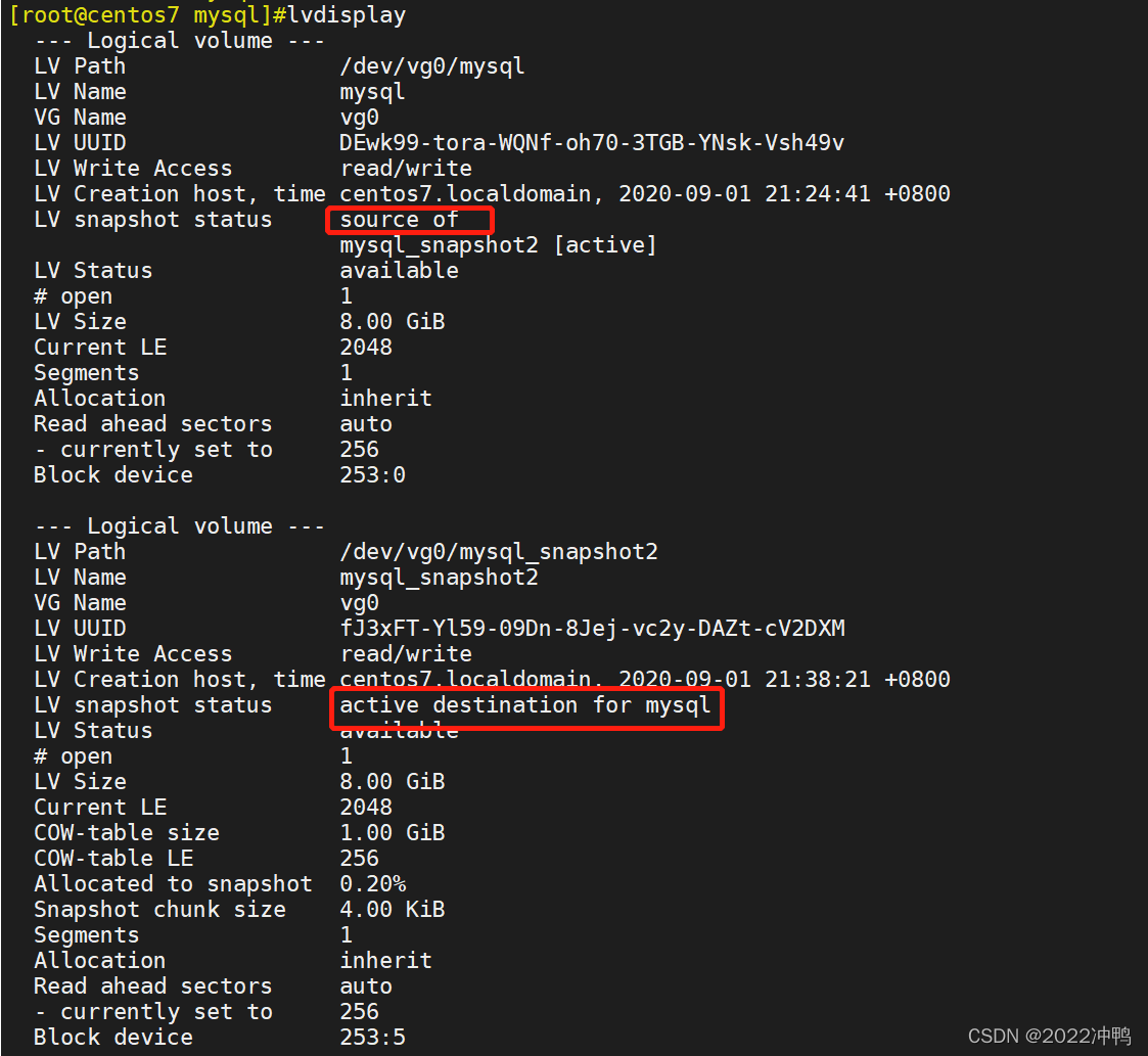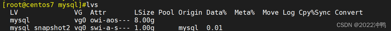 5、lvdisplay 可以看到/dev/vg0/mysql 为源;/dev/vg0/mysql_snapshot2为它的快照