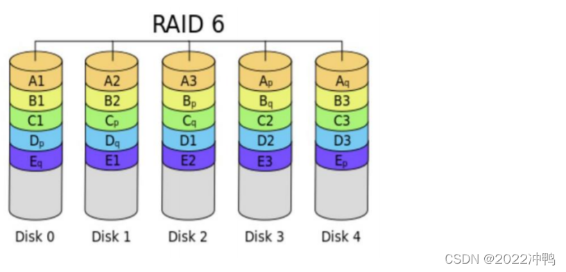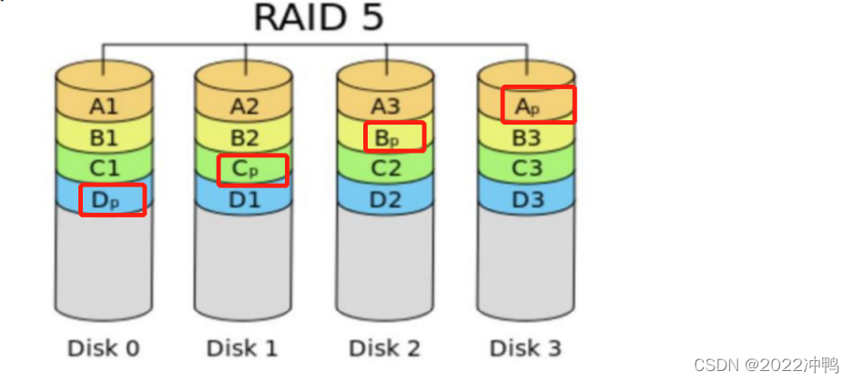 - 解决了校验盘压力大的缺陷,均等分配磁盘压力