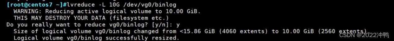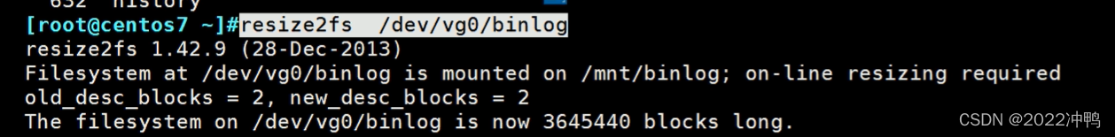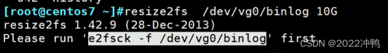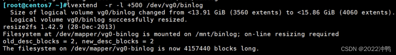 - 缩减文件系统resize2fs /dev/vg0/binlog 10G