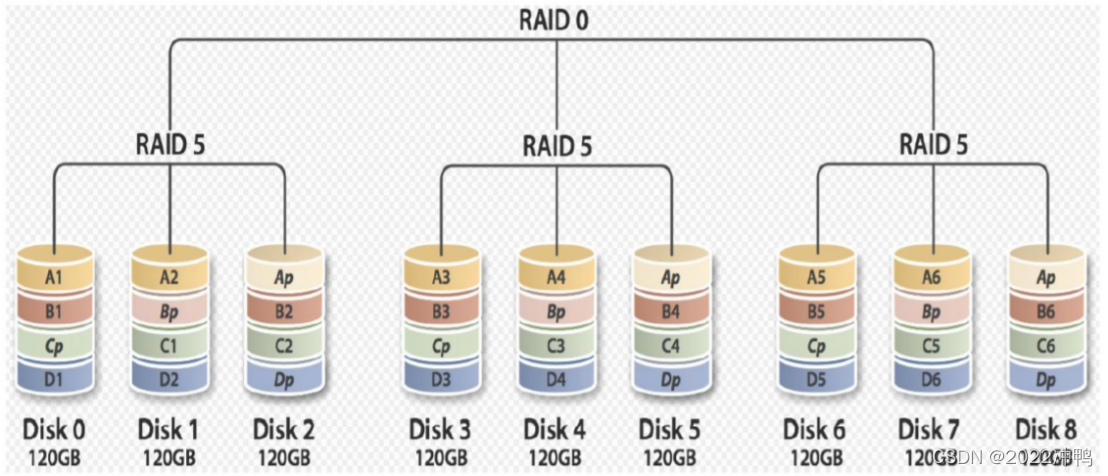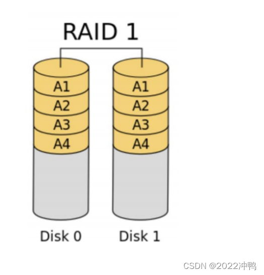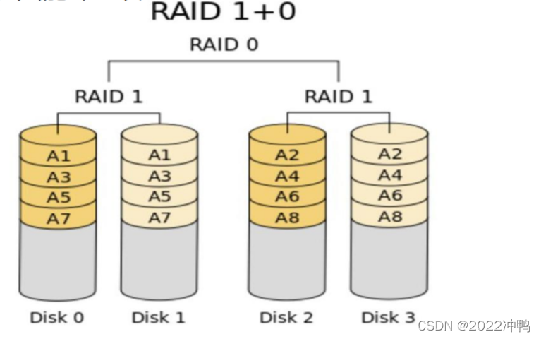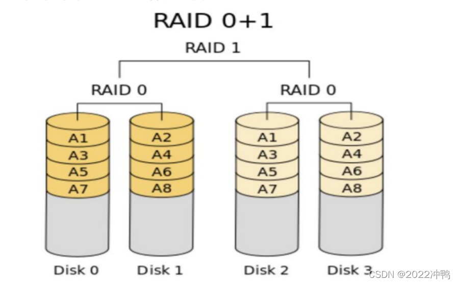 多块磁盘先实现RAID0,再组合成RAID1,磁盘利用率50%
