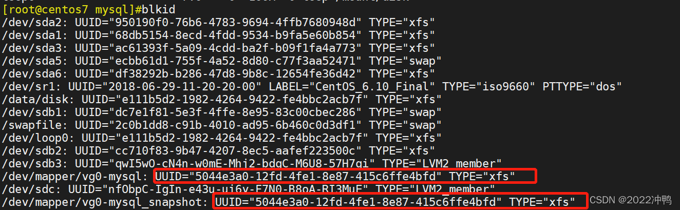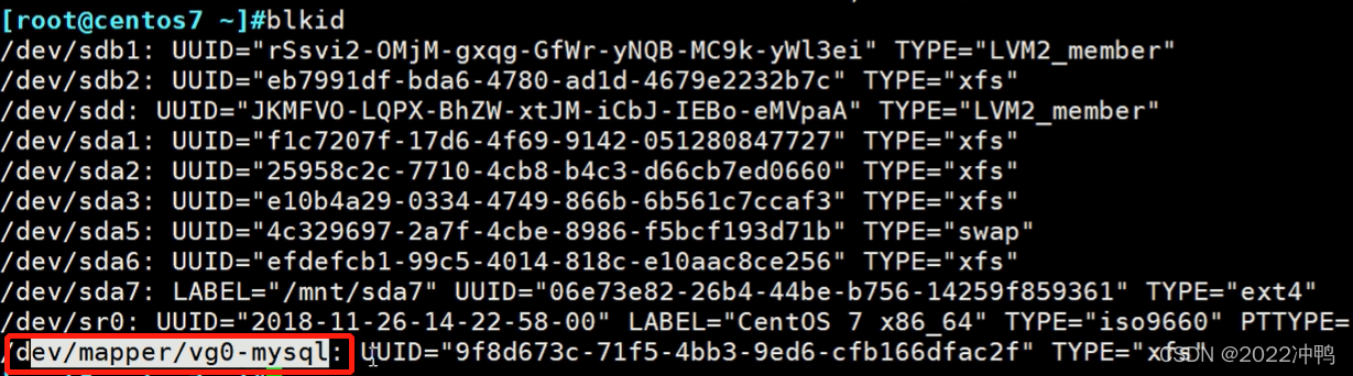 7、blkid 使用时不能使用逻辑卷的成员,必须用/dev/mapper/vg0-mysql