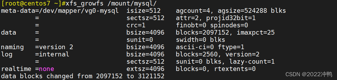 xfs_growfs ext /mount/mysql (挂载点) xfs系列的文件系统更新到内存中