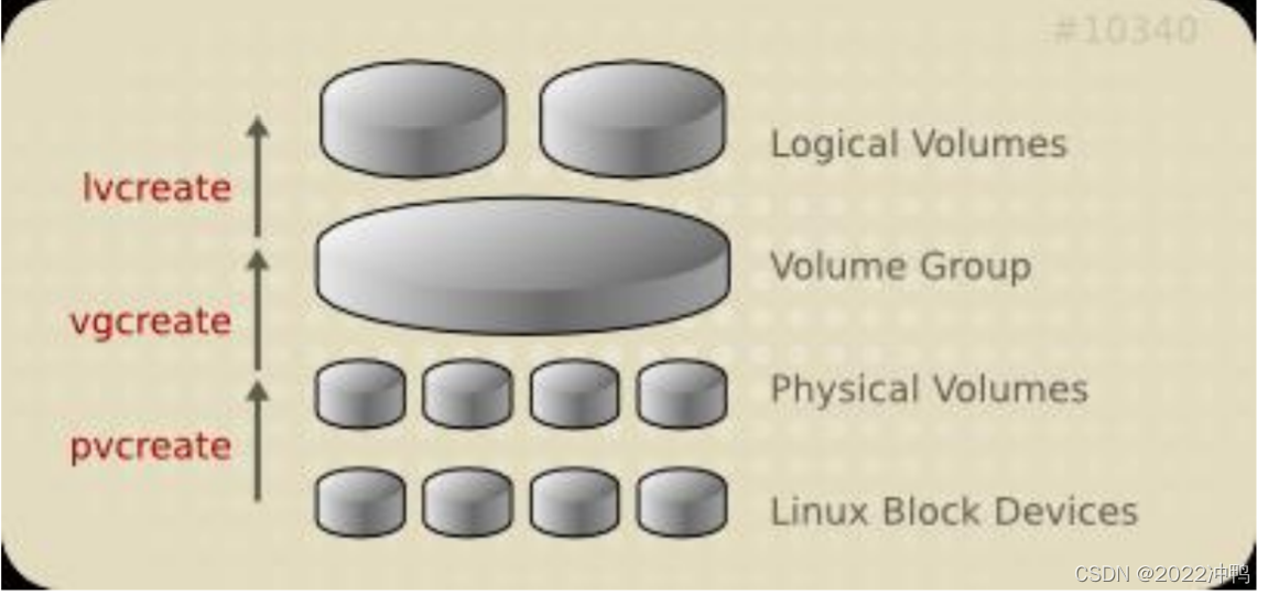 2、将几块磁盘(物理卷,PhysicalVolume)组合形成一个存储池或者卷组(VolumeGroup)。LVM可以每次从卷组中划分出不同大小的逻辑卷(LogicalVolume)创建新的逻辑设备。