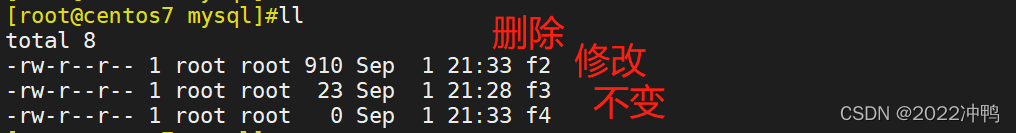 切换到原来的挂载点,可以看到保留的是修改前状态的文件:f2、f3、f4 ,而f5会丢失