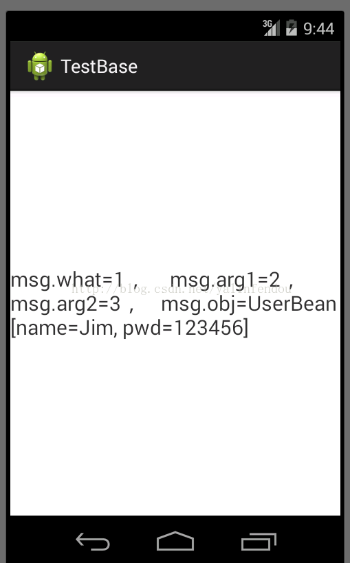 tv.setText("msg.what=" + msg.what + ", msg.arg1=" + msg.arg1