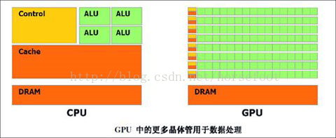 下面看看百度百科上CPU同GPU的对比图,其中绿色的是计算单元: