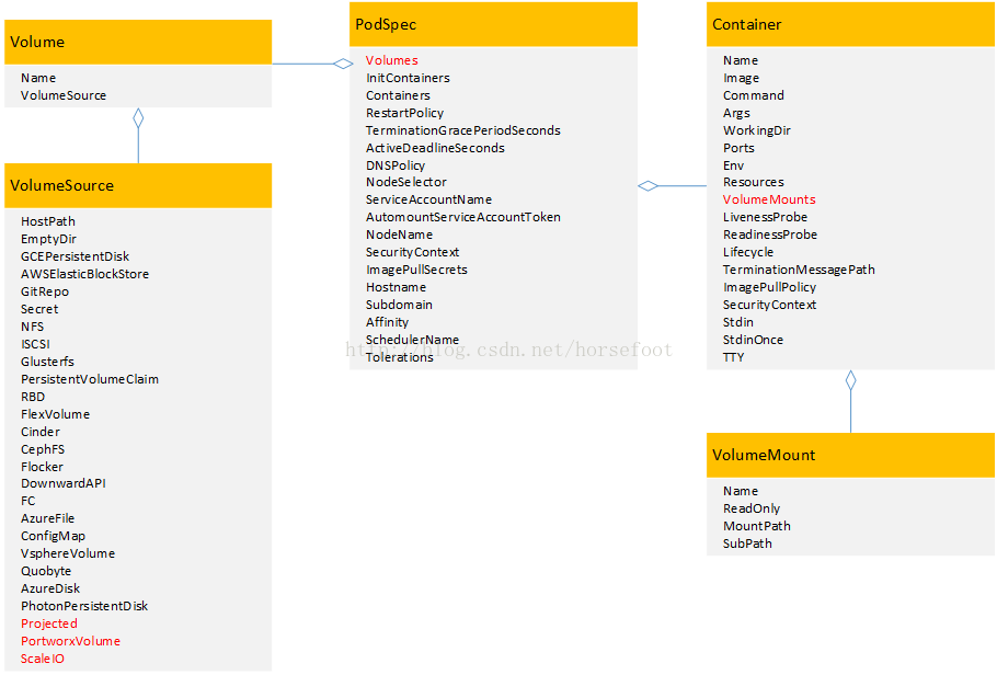 从图中可以看到结构体PodSpec有个属性是Volumes,通过这个Volumes属性可以关联到结构体Volume和结构体VolumeSource,而且这个Volumes属性是一个数组类型,就是说POD可以关联到多个不同类型的卷上面。
