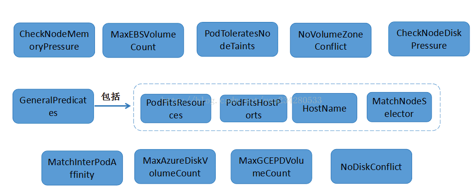(10) GeneralPredicates: 包含一些基本的筛选规则,PodFitsResources,PodFitsHostPorts, HostName,MatchNodeSelector