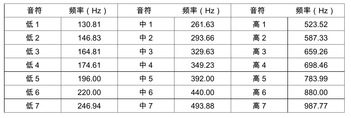 乐曲简谱中的每个音符及其节拍,在微机中对应了扬声器的发声频率和持续时间。其中简谱音符与扬声器的发声频率的对应关系见下表: