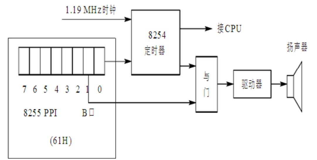 - 输出端口 61H 的 D1 位为“1”或为“0”时,将使控制驱动器的与门电路接通或关闭,使 8254 所发出的音频信号能到达驱动器或被阻断。这样通过控制 D1 位的变化,可使扬声器接通和断开,控制扬声器是否能发出声音。此外,通过控制 D1 位的通断时间,就能发出不同的音长。