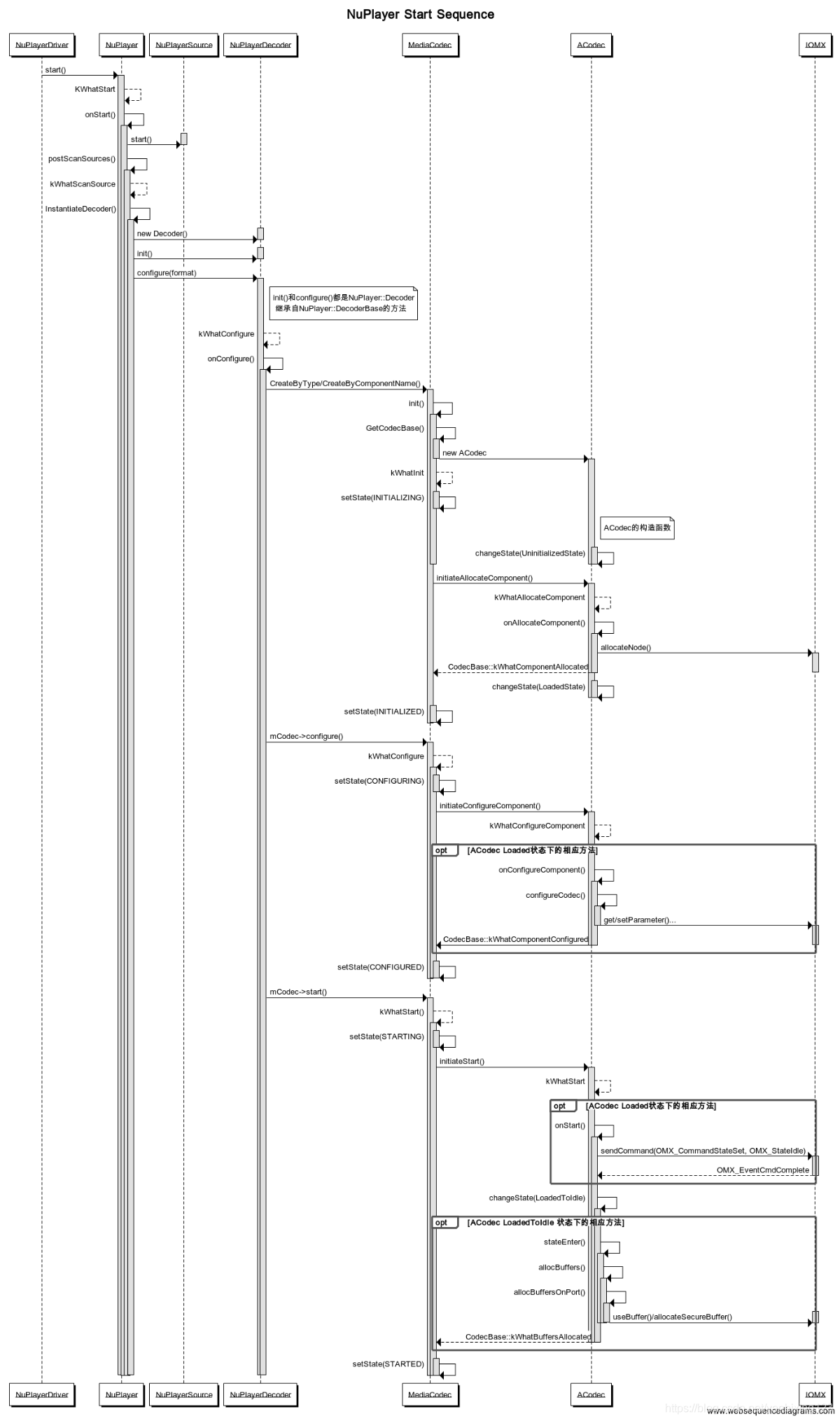 对应到 MediaCodec::start()函数,在这个函数中设置了Vector<MediaResource>,然后发送kWhatStart AMessage,在处理函数中,这时候的状态为CONFIGURED,所以不会执行onInputBufferAvailable函数,而是继续向下执行,首先通过setState设置状态为STARTING,然后执行mCodec->initiateStart();这个mCodec是ACodec了,继续跳到ACodec::initiateStart()中去执行,最后执行到ACodec::LoadedState::onStart()函数中,在这个函数中通过mCodec->mOMX->sendCommand设置状态为OMX_StateIdle,然后设置:mCodec->changeState(mCodec->mLoadedToIdleState)