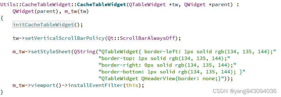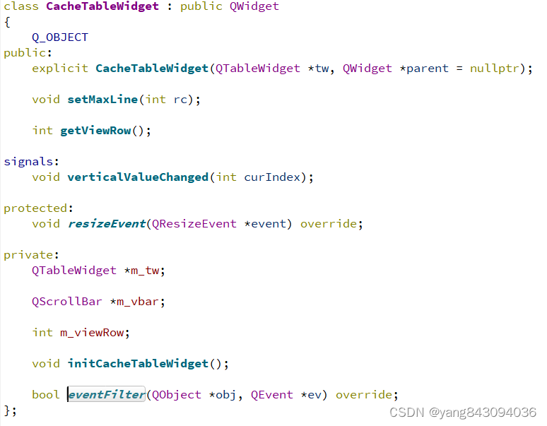 1、创建CacheTableWidget类,管理QTableWidget和自定义的QScrollBar对象,目的是要实现上述功能,需要隐藏QTableWidget自身的滚动条,利用自己创建的QScrollBar对象实现QTableWidget的滚动效果。