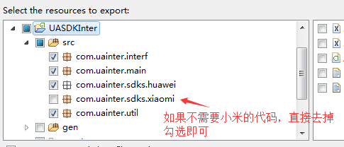 但是有些渠道会进行代码检测,例如360,会检测到包内含有小米支付相关的代码,审核不过,对应我们只需要在打jar的时候,勾选去掉对应的package就可以了。(因为是重构的代码框架,并没有包含很多sdk)