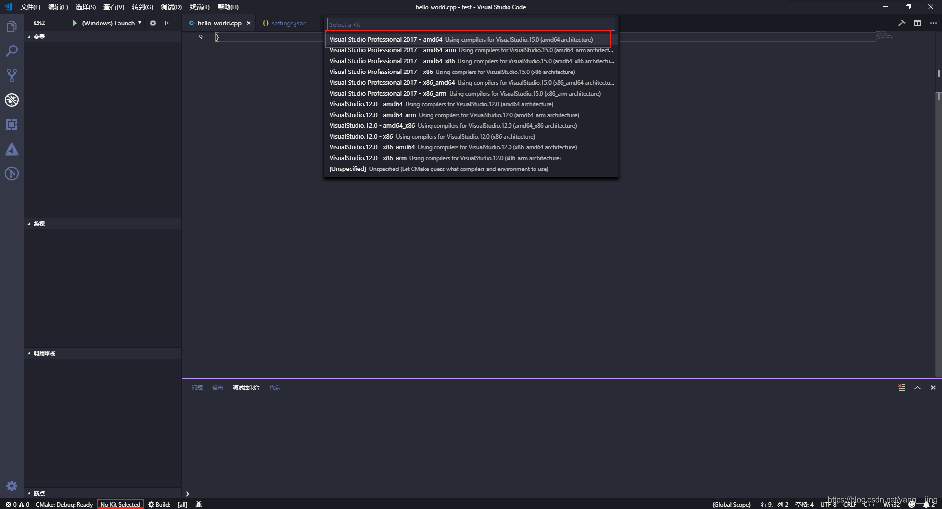 ②点击左下角No Kit Selected 搜索编译器,选择合适的编译器,也可以点击左下角更改编译器