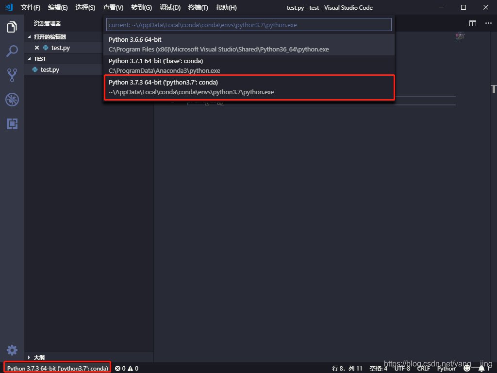 tips:选择解析器时,可以点击左下角选择,也可以按ctrl+shift+p,输入python,选择”选择解析器“