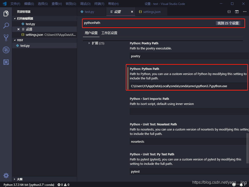 tips:可以将解析器目录保存在设置中,点击文件-首选项-设置(或ctrl+,)打开设置,搜索pythonPath输入解析器路径(或点击右上角{},添加输入"python.pythonPath": "C:\\Users\\YJ\\AppData\\Local\\conda\\conda\\envs\\python3.7\\python.exe"选择解析器路径)