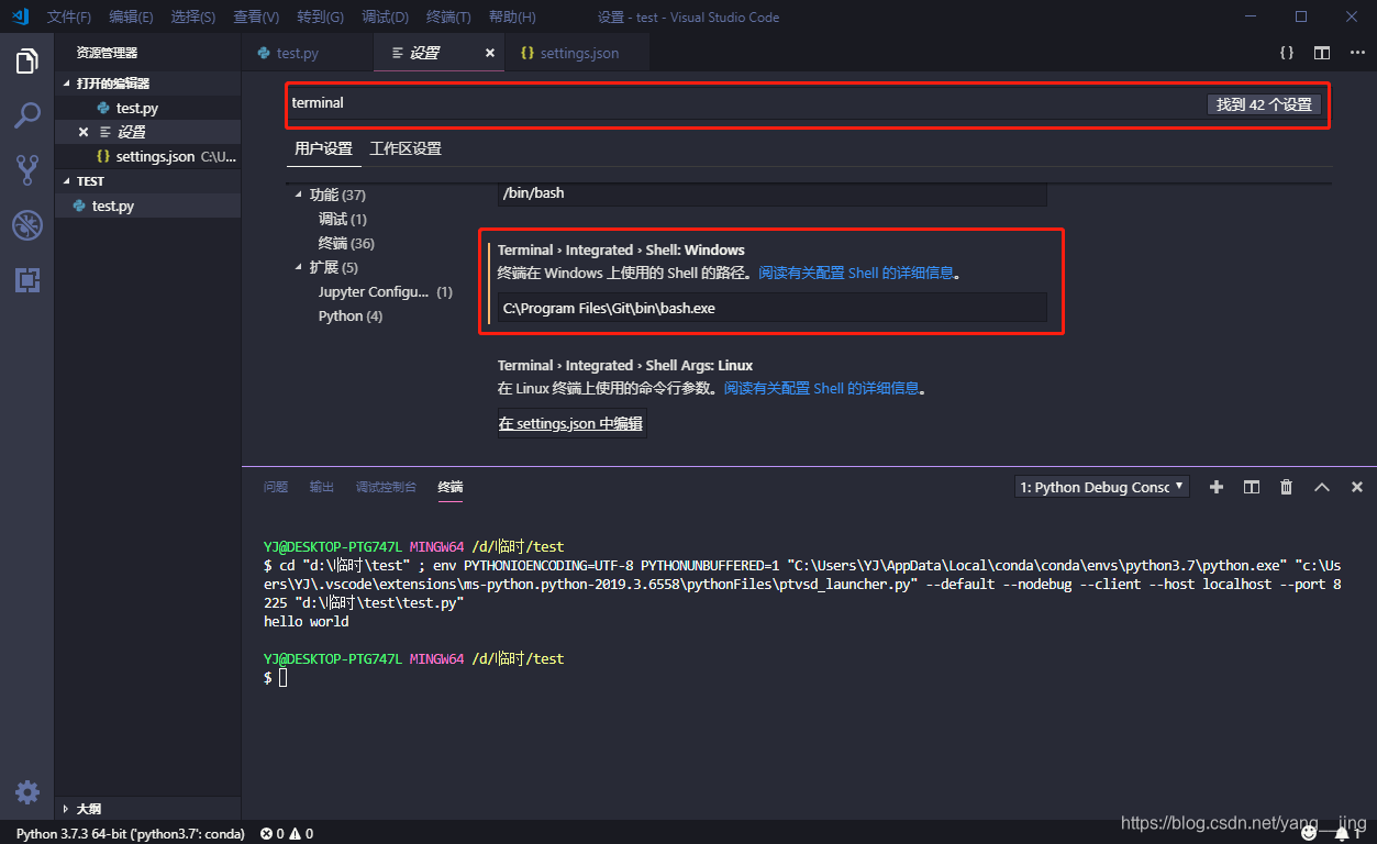 点击文件-首选项-设置(或ctrl+,)打开设置,搜索terminal,将终端修改为C:\Program Files\Git\bin\bash.exe(或点击右上角{},添加输入"terminal.integrated.shell.windows": "C:\\Program Files\\Git\\bin\\bash.exe"更改终端)
