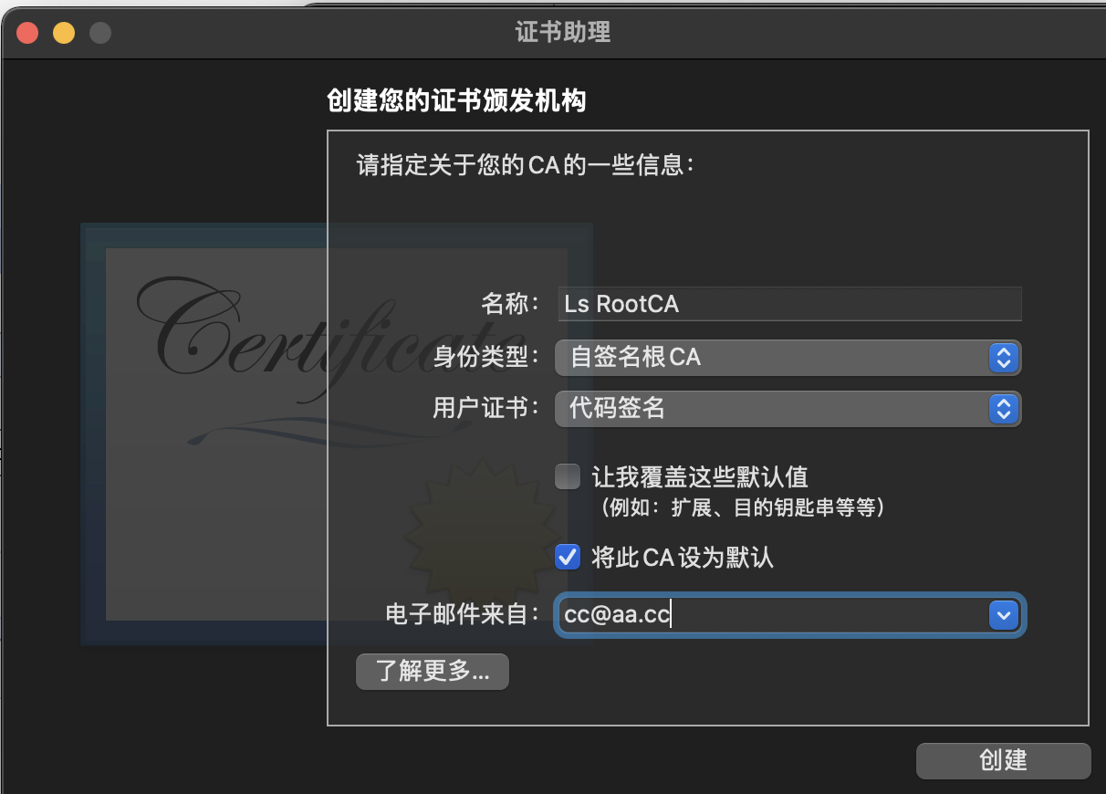 1. 首先在·钥匙串访问· -> 证书助理 -> 创建证书颁布机构