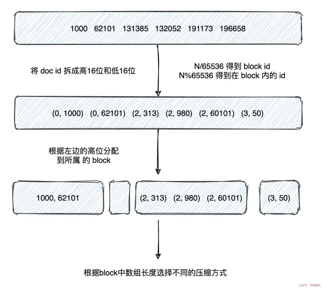 对于这类 postings list,ES 采用不一样的压缩方式。那么让我们一步步来。