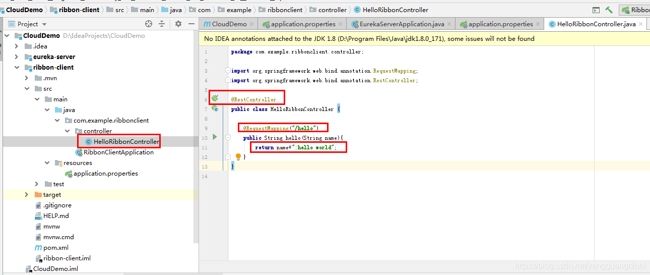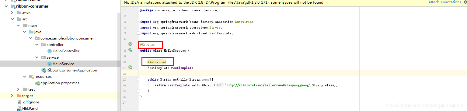 return restTemplate.getForObject("http://ribbon-client/hello?name=zhaoyangguang",String.class);