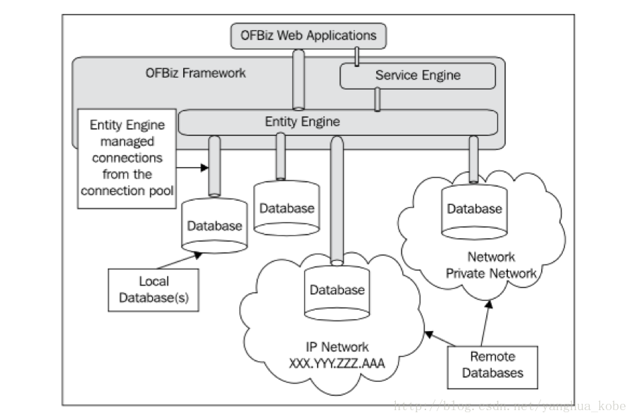 这张图是OFBiz的整体框架图。从图中可以看到OFBiz的所有app都构建在其framework之上。而其framework的核心就是ServiceEngine(服务引擎)以及EntityEngine(实体引擎)。其实体引擎对于数据库的种类以及拓扑结构的支持都非常健全。它支持本地数据库与远端数据库并存并且支持多达8种主流数据库。
