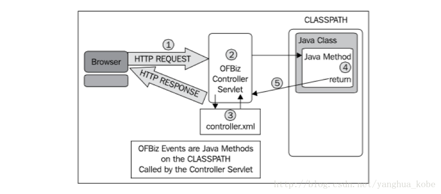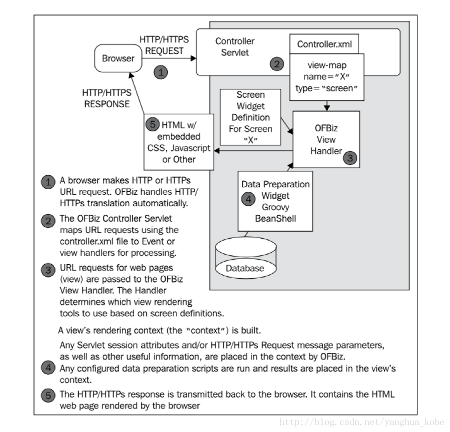 下面以一个客户端请求的处理过程来看OFBiz各个组件是如何交互以及衔接的。