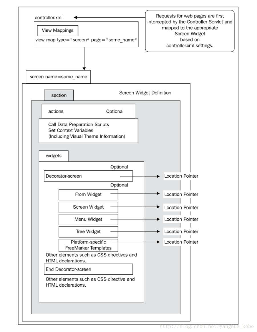 前端的内容通常是HTML+数据。widget并没有忽略数据这部分。只是一种布局技术,它最终会由webcontainer转化为html,只不过数据的处理(CRUD)通常位于服务器端。而这些动作都被抽象成为了widget中的“action”。一个screen通常包含各种其他组件widget的引用,这些组件widget可以是:form,screen,menu等。