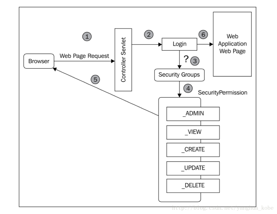 从图中可以看出常用的几个权限有:_ADMIN(管理员权限),_VIEW(浏览权限,为最小权限),_CREATE(创建权限),_UPDATE(编辑权限),_DELETE(删除权限)。因此如果controller.xml中配置了授权检查时,将会进行上图的权限检查流程。一个请求在处理之前,会检查其是否需要先进行登录。如果登录验证通过,会获取该会员的security group。而security group又是security permission的集合。进而可以判断用户是否有某个操作的权限。