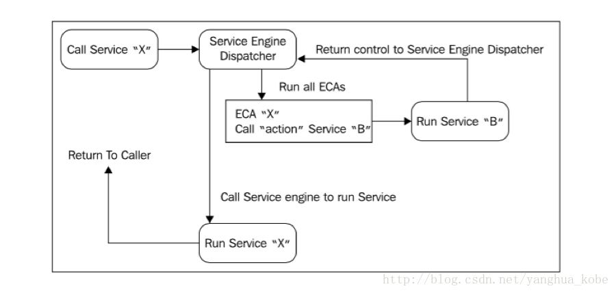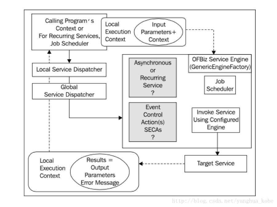 调用程序通过服务引擎框架调用服务后,服务引擎首先将调用服务的参数提取并构建服务调用的上下文。然后选择合适的dispatcher,它其实就是businessdelegate。由他选择合适的引擎来执行服务。OFBiz会先判断服务有没有“特殊性”,比如它是否是异步的?是否是递归执行的。如果是,那么会选择它内置的JobScheduler来执行。还有它是否是带SECA(ServiceEvent Control Action)的?如果是SECA,那么会先执行SECA然后选择已配置的特定引擎来执行真正的目标服务,而在这个过程中会有一个Map来充当执行的上下文,用于存储中间结果、错误信息以及最终结果。执行完成之后,上下文对象会在调用栈中层层回退,并将最终的执行结果返回给调用端。
