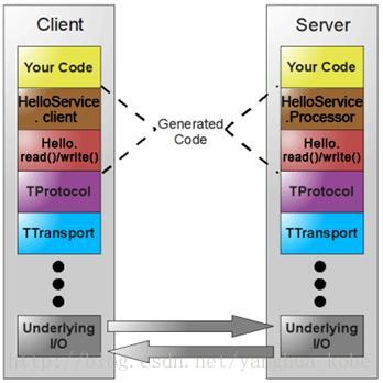 Thrift的实现是基于类似TCP/IP的多层协议栈模型。它的特点是对等通信,逻辑分离,分层解耦。如下图: